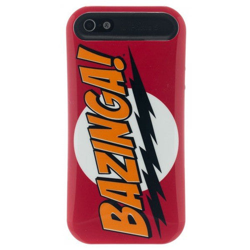 Always be ready to prank your friends when you carry this fun Big Bang Theory phone case! The Big Bang Theory Bazinga iPhone 5 Phone Case is a red, snap-on hard shell with a rubber bumper. It features the word "Bazinga!" in orange letters over a white circle, the phrase Sheldon uses when he pulls one over on his friends on TV's The Big Bang Theory.