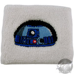 R2-D2 sports bushy black hair on this Family Guy wristband inspired by the Family Guy spoof of the Star Wars movies. The Family Guy R2D2 Wristband is white terrycloth that stretches to fit most sizes, and is embroidered with an image of the little droid's top section.