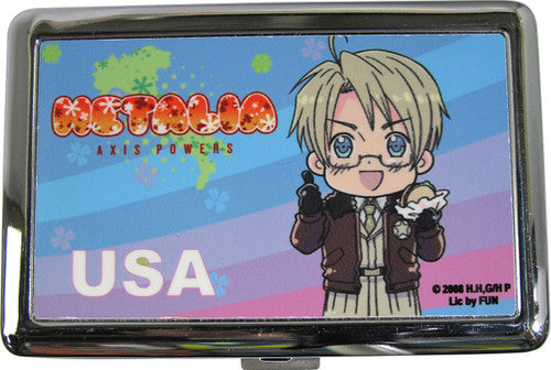 A delicious cheeseburger gets a thumbs-up from the character "America" on this funny, extra-large Hetalia card case! The Hetalia USA Large Card Case is silver with double-sided holders and a spring-loaded hinge. The top features a chibi-style image of America from the manga and anime series Hetalia: Axis Powers, along with the series' title logo and the initials "USA" on a blue and violet rainbow pattern!