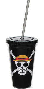 Hoist a drink and a flag to the Straw Hat Pirates with this cool One Piece travel cup! The One Piece Jolly Roger Travel Cup is a black, plastic travel cup with lid and straw that holds 16 ounces. It features the flag symbol of the Straw Hat Pirates, a Jolly Roger skull and crossbones wearing a gold straw hat with a red stripe, which also serves as the logo for the anime One Piece. Hail to the Pirate King!
