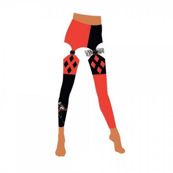 Show your dangerous side when you slip on this jester-like pair of Harley Quinn tights! The Harley Quinn Footless Tights are red with a dye sublimated print. The red and black patterns mimic the costume worn by Harley Quinn, Batman's enemy and the Joker's girlfriend. An image of a playing card, flowers and dice are at the top left thigh, while an image of the DC Comics villain wielding her giant mallet is at the bottom right calf.