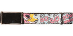 The Pink Ranger throws a ninja punch on this colorful and fun Power Rangers belt! The Power Rangers Go Go Pink Pterodactyl Mesh Belt is light blue, adjustable up to a 45-inch waist size. It features a portrait of the heroine from the Mighty Morphin Power Rangers universe framed by a yellow splash of color, with outlines of her helmet and her catchphrase in pink letters, "Go Go Power Rangers!"