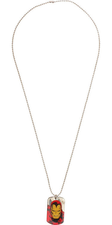 The heavily armored Iron Man scowls on this eye-catching Iron Man dog tag! The Invincible Iron Man Bust Name Single Dog Tag is a silver dog tag with a double-sided design on a 22-inch ball chain. One side features the title logo for Marvel Comics' The Invincible Iron Man, and the other side features a portrait of the red-and-yellow armored superhero and The Avengers stalwart!