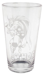 This Thor glass features an etched version of an iconic pose by the God of Thunder! The Thor Etched Pint Glass is a clear, 6-inch tall glass that holds a pint. It features an etched version of a classic image of the Avengers member and Marvel Comics superhero about to hurl the magic hammer Mjolnir, with the title logo of The Mighty Thor series below!