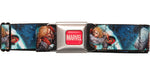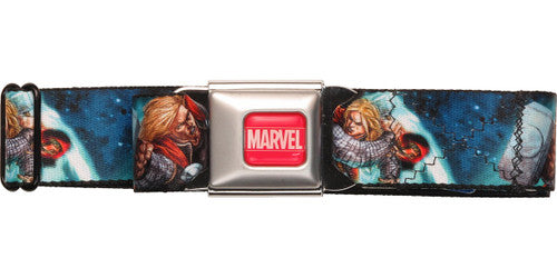 Wield a magic hammer when you wear this colorful and fun Thor belt! The Thor Hammer Attack Seatbelt Belt is a 1.5-inch wide belt adjustable from a 24-inch to a 42-inch waist size, with a metal seat belt-style buckle. The buckle features the title logo for Marvel Comics. The belt features the God of Thunder from the Thor and The Avengers series on a starry background, red cape swirling, magic hammer Mjolnir in hand!