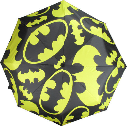 Make a splash when you open this colorful and batty Batman umbrella! The Batman All Over Logos Umbrella is black. The top is covered by small, medium-size and large bat-logos from DC Comics' Batman series, both black-and-yellow classic versions and plain yellow outlines. Summon the Dark Knight!
