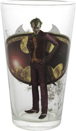 A bat-logo crumbles behind the evil Joker on this fun Batman glass! The Batman Arkham Knight Joker Toon Tumbler Pint Glass is clear. One side of this Toon Tumblers pint glass features the title logo for the videogame Batman: Arkham Knight, while the other side has a portrait of a smiling Joker standing in front of the bat-logo symbol from the videogame series!