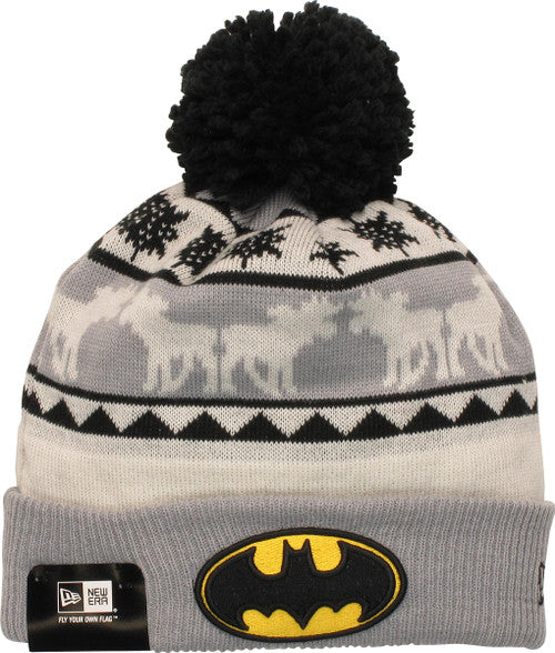Celebrate Christmas Gotham City-style with this warm and comfortable Batman beanie! The Batman Moose Flakes Pom Beanie is white with a gray cuff and a black pom. The turned-up cuff is embroidered with the famous bat-logo from DC Comics' Batman series, and the top features a herd of moose on a gray band below a string of snowflakes!