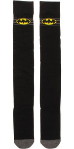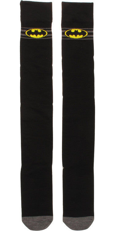 Signal your Dark Knight wearing this cool pair of Batman socks for women! The Batman Small Logo Ladies OTK Socks includes one pair of black, over-the-knee socks with gray heels and toes. Each sock features four gray stripes framing front-and-back images of the classic bat-logo from DC Comics' Batman series, a black bat spreading its wings within a yellow oval. Holy symbolism, Batman!