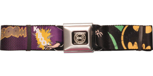 Selina Kyle brings explosive action to this colorful and fun Catwoman belt! The Catwoman Kaboom Seatbelt Belt is purple with a silver metal seatbelt-style buckle, adjustable from 24-inch to 42-inch waist sizes. The buckle features the logo for "DC Comics Originals," and the belt has portraits of the feline villainess from DC Comics' Batman and Catwoman series', with a classic bat-signal and the word "Kaboom" on a yellow starburst!