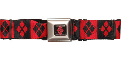Signal you're a wild child wearing this cool Harley Quinn belt! The Harley Quinn Checkered Symbols Seatbelt Belt is black and red with a metal seatbelt-style buckle, and is adjustable from 24-inch to 42-inch waist sizes. The buckle features the red "playing card diamond" symbol worn by the Dark Knight's nemesis Harley Quinn in DC Comics' Batman series, and the belt has repeated images of the diamond emblem in black-on-red and red-on-black. "We're bad guys, it's what we do!"