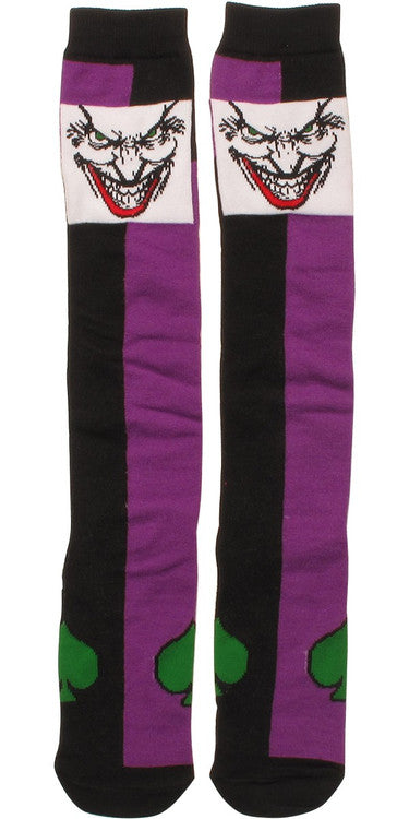 Identify with the supervillains when you wear this fun pair of Joker socks for women! The Joker Face Ladies Knee High Socks are purple-and-black knee-high socks in ladies' sizes with black cuffs and toes. Inspired by DC Comics' Batman series, each sock features a cartoon image of a grinning Joker, the Dark Knight's nemesis, at the top, and two green playing-card "club" symbols on each side!
