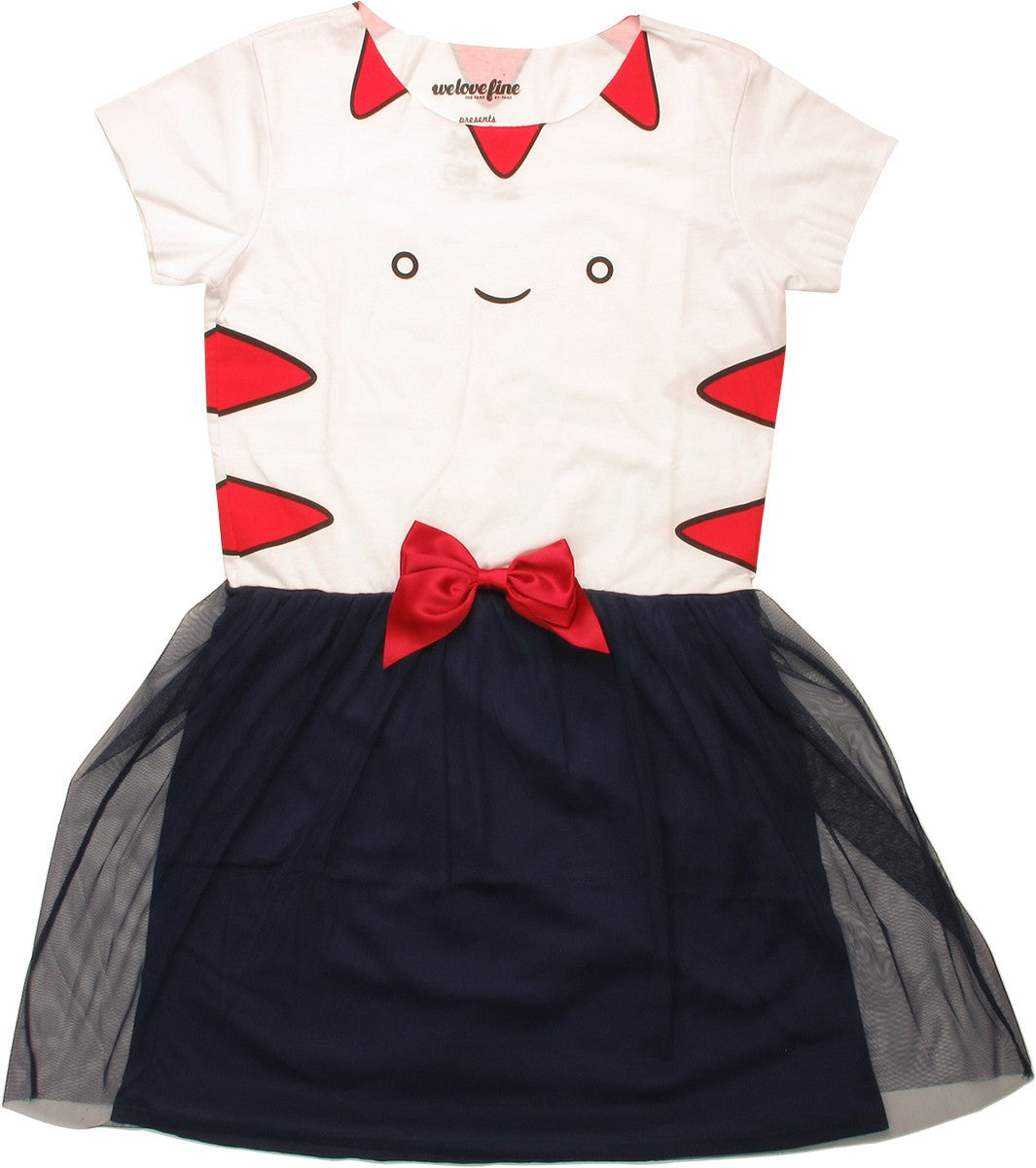 Serve the Candy Kingdom and wear this fun Adventure Time dress and costume in junior sizes! The Adventure Time Peppermint Butler Dress is white with cap sleeves and a mesh overlay skirt. Inspired by TV's wacky Adventure Time animated series, it has the features of Peppermint Butler, Princess Bubblegum's loyal servant, complete with smile, red "peppermint candy" stripes and red bow tie!