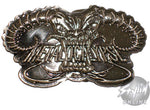 Honor the death metal band Dethklock from the animated TV series Metalocalypse with this Metalocalypse belt buckle! The Metalocalypse Logo Belt Buckle is silver and features the logo for the fictional band, a demon with ram's horns baring its fangs behind the word "Metalocalypse." The parody of heavy metal music culture airs on the Adult Swim network.