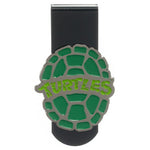Put a ninja hold on your cash with this cool Ninja Turtles money clip! The Ninja Turtles Shell Money Clip is black. A silver and green decorative piece in the shape of the shells on the backs of the characters from Teenage Mutant Ninja Turtles is attached to the clip, and includes the word "Turtles" in light green letters. Bodacious!