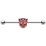 A die cut version of the eye-catching Autobots logo highlights this cool Transformers barbell body jewelry! The Transformers Autobot Die Cut Industrial Barbell is silver surgical steel, externally threaded. The red-outline Autobots logo is from the Transformers series. Transform and roll out!