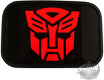 This rectangular Transformers belt buckle features a stark and dramatic rendering of the logo for the Autobots from the Transformers series! The Transformers Autobot Red Symbol Buckle is black with a vivid red Autobots logo in the middle, with the black lines of the logo meshing with the black background. Autobots to the rescue!