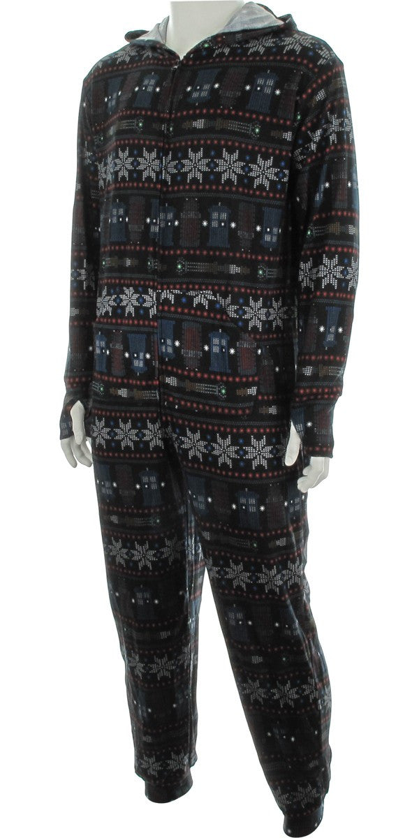 TARDIS time machines and Sonic Screwdrivers mix with snowflakes on these Doctor Who pajamas! In navy blue and with a zipper closure, these Doctor Who Snow Flake Hooded Union Suits are adult Christmas pajamas that blend holiday cheer and TV show icons. Images from the science fiction TV series Doctor Who take on a holiday theme in conjunction with rows of snowflakes covering the front and back of this warm and comfortable Doctor Who union suit with a hood!