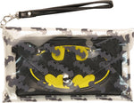 Trust your valuables to the Dark Knight when you wear this cool Batman wristlet wallet! The Batman Classic Logo Wristlet Wallet is black with a zipper closure and a detachable wrist strap, enclosed by a clear envelope clutch covered with small gray bat-logos. It features a large, classic version of the bat-logo from DC Comics' Batman series, a black bat spreading its wings within a yellow oval!
