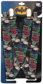 Relive the thrills of Batman battling the Joker when you wear this colorful and fun set of Batman suspenders! The Batman Comic Panels Suspenders are 1-inch wide with adjustable elastic straps and metal clips. Each suspender features a series of panels from DC Comics' Batman comic book showing the Dark Knight battling the deadly Joker!
