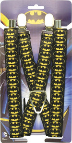 The classic bat-logo rules on these cool Batman suspenders! The Batman Logo Stack Black Suspenders are black. They include two adjustable elastic straps, each 1-inch wide, with metal clips. Each suspender features stacked images of the bat-logo, a black bat within a yellow oval, symbolizing the Dark Knight from DC Comics' Batman series!