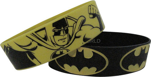 Celebrate the Dark Knight wearing this fun Batman wristband set! The Batman Logos Action Rubber Wristband Set includes two black-and-yellow, flexible rubber bands, 1-inch wide. Inspired by DC Comics' Batman series, one features a portrait of Batman in action with the word "Batman" in black letters, and the other has repeated images of the classic bat-logo, a black bat spreading its wings within a yellow oval.