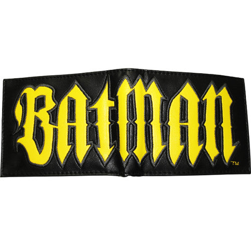 Go Gothic with this artistic Batman wallet! The Batman Name Bifold Wallet is black with faux leather and a window ID pocket. This bifold wallet features the word "Batman" on the outside in Gothic yellow letters outlined in gray, while the bright yellow interior is decorated with a black outline batwing symbol.
