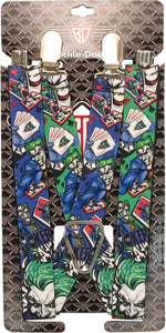 The villainous Joker plays with a loaded deck on these colorful and fun Joker suspenders! The Joker Card Collage Suspenders include two adjustable elastic straps, each 1-inch wide, with metal clips. Each suspender features images of the DC Comics supervillain the Joker from the Batman universe playing cards stacked in his favor!
