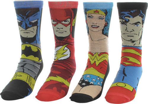 Celebrate a different member of The World's Greatest Superheroes team every day with this awesome set of Justice League socks! The Justice League of America Heroes 4 Pair Socks Set includes four pairs of crew cut socks. Inspired by DC Comics' Justice League of America series, the socks feature Batman, Flash, Wonder Woman and Superman with different shades of black, red and blue!