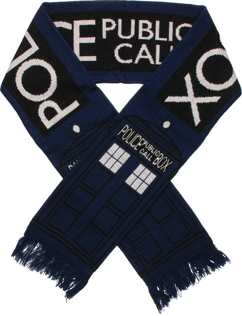 Show you're a fan of time travel when you wear this cool Doctor Who scarf! The Doctor Who TARDIS Scarf is navy blue with fringed ends. It features words and images from the TARDIS time machine on the TV series Doctor Who, including the words "Police Public Call Box."