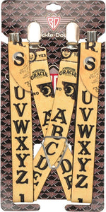 Add a little mysticism to your wardrobe with these colorful and fun Ouija board suspenders! The Ouija Board Suspenders are beige. They include two adjustable elastic straps, each 1-inch wide, with metal clips. Each suspender features the letters and "moon" images from Hasbro's version of the ouija board. Do you possess the spirit?