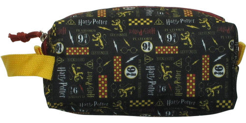 Add a touch of magic to your travels carrying this fun Harry Potter toiletry bag! The Harry Potter Platform Nine Toiletry Bag is black with a yellow handle and a red zipper closure. Based on the Harry Potter book and movie series, it features the series title logo and various images including Harry's lightning-bolt scar and glasses, the Gryffindor lion and name, the Deathly Hallows symbol, the "9 3/4" designation for the magically concealed train station platform from which students board the Hogwarts Express, and more. "Never Tickle a Sleeping Dragon!"