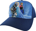 A dye sublimated image brings to life the group portrait on the front of this youth-sized Frozen hat! The Frozen Cast Sublimated Buckle Youth Hat is navy blue with a dye sublimated print and a buckle closure. The front features the cast of the movie Frozen, with Sven, Kristof, Elsa, Anna and Olaf. "It is not nice to throw snow, people!"
