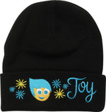 Spread the joy when you wear this fun and warm Inside Out beanie! The Inside Out Joy Cuff Beanie is black with a black cuff. The turned-up cuff features yellow and blue flowers, the word "Joy" in blue, and the smiling face of the emotion Joy from the movie Inside out. "Come on, group hug!"