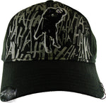 The Joker laughs forever on the front of this cool Joker hat with three black rings piercing the bill! The Joker Rings Hat is black. The front of this six-panel baseball cap features Heath Ledger as the Joker from the movie The Dark Knight, based on DC Comics' Batman series, amid the words "Ha Ha" repeated in gray letters. The back, with a Velcro closure, features the words "The Joker" in gray letters.