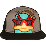 An embroidered image of Perry the Platypus as Agent P in disguise with star glasses highlights the front of this funny Phineas and Ferb hat! The Phineas and Ferb Star Glasses Hat is black with a gray front. The words "Agent P" are printed under the visor in yellow on an aquamarine background. On the front, Agent P wears huge red "star" glasses along with a brown hat to disguise his identity and go undercover!
