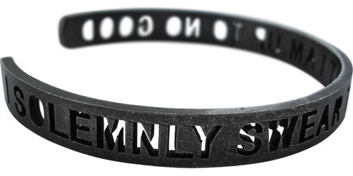 Open up the Marauder's Map with this funny Harry Potter bracelet! The Harry Potter Solemnly Swear No Good Cuff Bracelet is gray with die cut lettering. Inspired by the Harry Potter book and movie series, it features the words "I solemnly swear that I am up to no good," the key to the Marauder's Map that shows all of the grounds and classrooms of the Hogwarts School of Witchcraft and Wizardry!