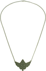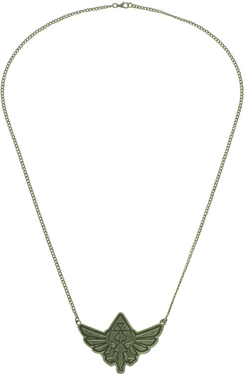 The Triforce sits atop the Hylian Crest on this cool Zelda necklace! The Zelda Skyward Sword Crest Antique Necklace is nickel gray. The charm is shaped like the modified crest of the royal family of Hyrule featured as the logo for the videogame The Legend of Zelda: Skyward Sword. Join Link and Zelda in the land below the clouds!