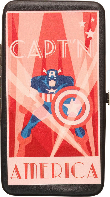 Art deco design highlights a patriotic superhero on this colorful and fun Captain America wallet! The Captain America Art Deco Clutch Wallet is a red, faux leather clutch with a window ID pocket and a zipper coin pocket. Based on Marvel Comics' Captain America, it features an art deco image with the Star Spangled Avenger wielding his shield, framed by spotlights, stars and the words "Capt'n America!"