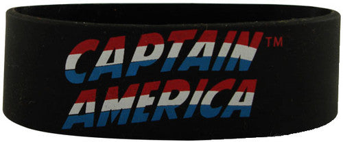 Show your patriotism with this cool Captain America wristband that stretches to fit most wrists! The Captain America Logo Rubber Wristband is black, and features the logo for the Marvel Comics series Captain America, the superhero's name in letters striped red, white and blue! Assemble the Avengers!