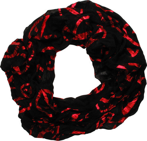 Get comfortable with sarcasm when you wear this silky Deadpool infinity scarf made with viscose fabric! The Deadpool Foiled Logos AoP Viscose Infinity Scarf is black. Inspired by Marvel Comics' Deadpool series, it features an all-over print with foiled images of the Deadpool logo, a red, bisected circle with two "eyes," as worn by the always-sardonic Merc with a Mouth!