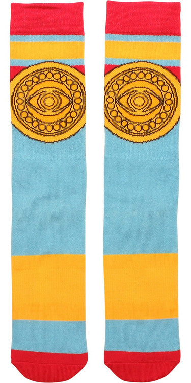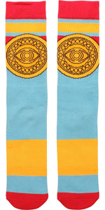 Question reality and change your destiny wearing this colorful and fun pair of Doctor Strange socks! The Dr Strange Eye of Agamotto Striped Crew Socks are blue with yellow stripes and red cuffs, heels and toes. Inspired by Marvel Comics' Doctor Strange series, each sock features a wide red stripe framing a golden Eye of Agamotto, the mystical, all-seeing Eye inside the amulet worn on Stephen Strange's chest. "The impossibilities are endless."