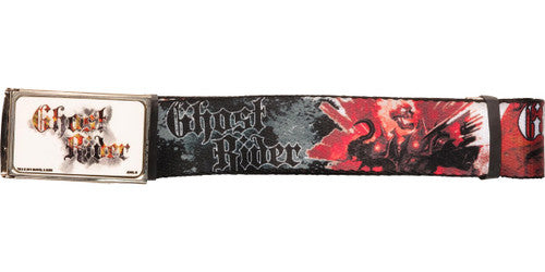 Ride free and raise hell wearing this cool Ghost Rider belt! The Ghost Rider Name Buckle Action Mesh Belt is black and adjustable. This mesh belt features a white buckle with the logo for Marvel Comics' Ghost Rider series in Old English font, and an image of the supernatural antihero amid a fiery explosion. "Let's Ride!"