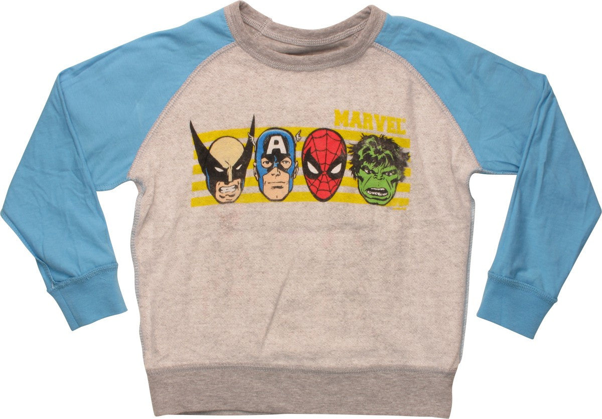 Classic images of Marvel Comics superheroes including the X-Men highlight this reversible Marvel sweatshirt in juvenile sizes! The Marvel Big Group Fight Ready Juvenile Sweatshirt is heathered gray with a distressed print and blue sleeves. This warm and comfortable pullover features portraits of Wolverine, Captain America, Spider-Man and Hulk framed by yellow stripes on one side, while the reverse side has a group shot with Sub-Mariner, Spider-Man, Wasp, the Human Torch, Angel, Giant-Man, Nick Fury, Doctor Strange, Hulk, Mr. Fantastic, Invisible Woman, the Thing, Phoenix, Iron Man, Captain America, Thor, Cyclops, Iceman and Beast!