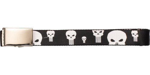 Menacing white skulls appear to float along this cool Punisher belt! The Punisher Logos Mesh Belt is a black, 1.25 inch wide mesh belt, adjustable up to a 45-inch waist size. It features the skull emblem worn by the vigilante in Marvel Comics' The Punisher series in various sizes!