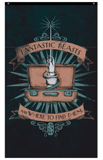A magic trunk and a slithering serpent highlight this cool Fantastic Beasts banner flag! The Fantastic Beasts Wand Case Banner Flag is black and blue-green. It features two banners with the title of the movie Fantastic Beasts and Where to Find Them above and below a blue-green starburst pattern framing an image of the magical beast-holding suitcase carried by Magizoologist Newton Scamander, with a hand emerging with a magic wand, the arm encircled by a blue-green snake!