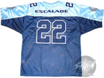 This V-neck Cadillac football jersey has the symbol for the Cadillac automobile brand on the front in light blue. The Cadillac Symbol Football Jersey is blue and made of mesh on the bottom portion. The number "22" is on the shoulders and on the back in blue, and the back also includes the word "Escalade." The sleeves also have Cadillac symbols.