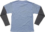 Stay warm and enjoy a pun wearing this funny, long-sleeved dinosaur t shirt in juvenile sizes! The Funny Stash-A-Saurus Long Sleeve Juvenile T-Shirt is heathered blue with heathered navy blue long sleeves. The front features a large image of a ferocious Tyrannosaurus rex dinosaur with a painted-on black mustache and the words "Stash-A-Saurus" in white letters caught between its sharp teeth!