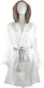 Rock the double-bun look that saved the Rebel Alliance with this fun Star Wars robe in junior sizes! The Star Wars Princess Leia Hooded Satin Junior Robe is white with a brown hood. This soft and comfortable satin robe features the white outfit worn by Princess Leia in the Star Wars movie series with a hood that mimics the look of her brown hair with "bun" patterns drawn on the sides!