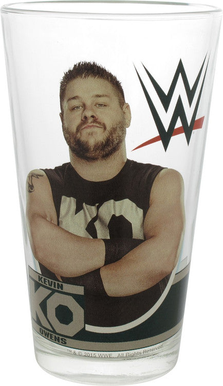 Get your Smackdown on and pour your favorite beverage into this cool WWE glass! The WWE Kevin Owens KO Pint Glass is clear. It features the "W" logo for the WWE, World Wrestling Entertainment Inc., with a portrait of wrestler Kevin Owens standing with his arms crossed, with his nickname "KO" at the bottom with his name!